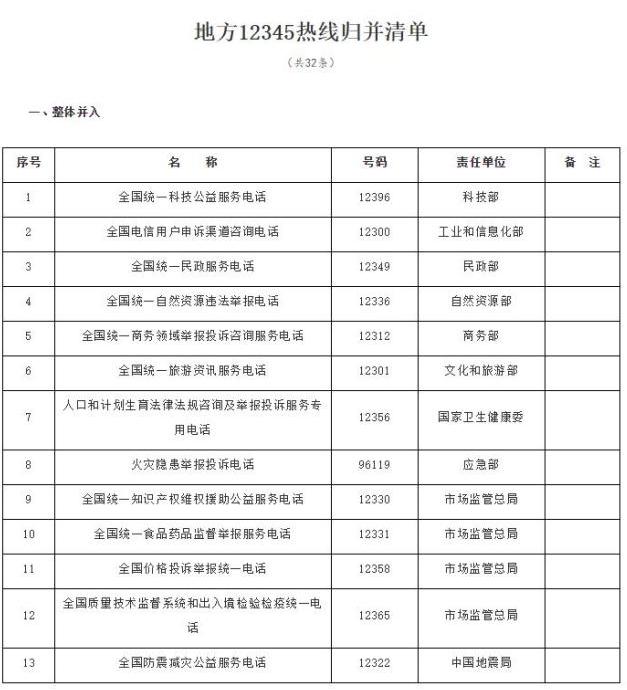 1月6日,中国政府网公布了《国务院办公厅关于进一步优化地方政务服务便民热线的指导意见》,明确了政务服务便民热线归并的事宜,各地区归并后的热线统一为“12345政务服务便民热线”,其中13条热线将整体并入,14条双号并行,5条设分中心。其中责任单位为市场监管总局的12330、12331、12358、12365将整体并入地方12345热线,12315市场监管投诉举报热线将与12345政务服务热线双号并行。