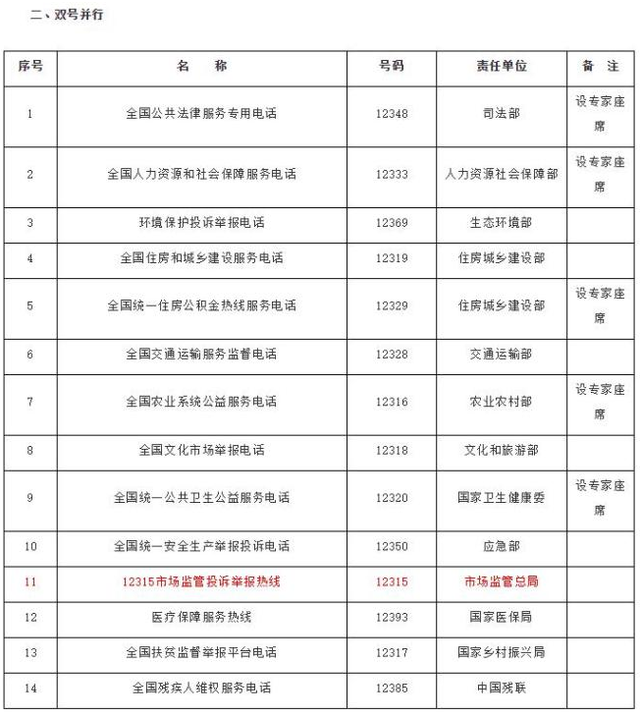 双号并行。话务量大、社会知晓度高的政务服务便民热线,保留号码,将话务座席并入12345热线统一管理。对于不具备归并条件的热线,可以保留话务座席,与12345热线建立电话转接机制,按照12345热线标准统一提供服务,具体由各地区根据实际情况决定。